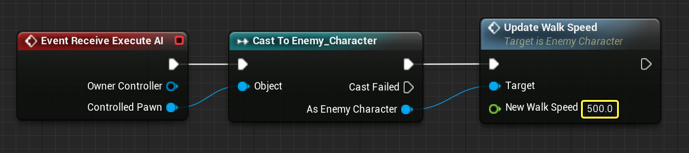 - BTT_ChasePlayer 태스크로 돌아와 As Enemy Character 노드에서 Update Walk Speed 를 호출하고 500.0 으로 설정한 후 다음과 같이 연결합니다.