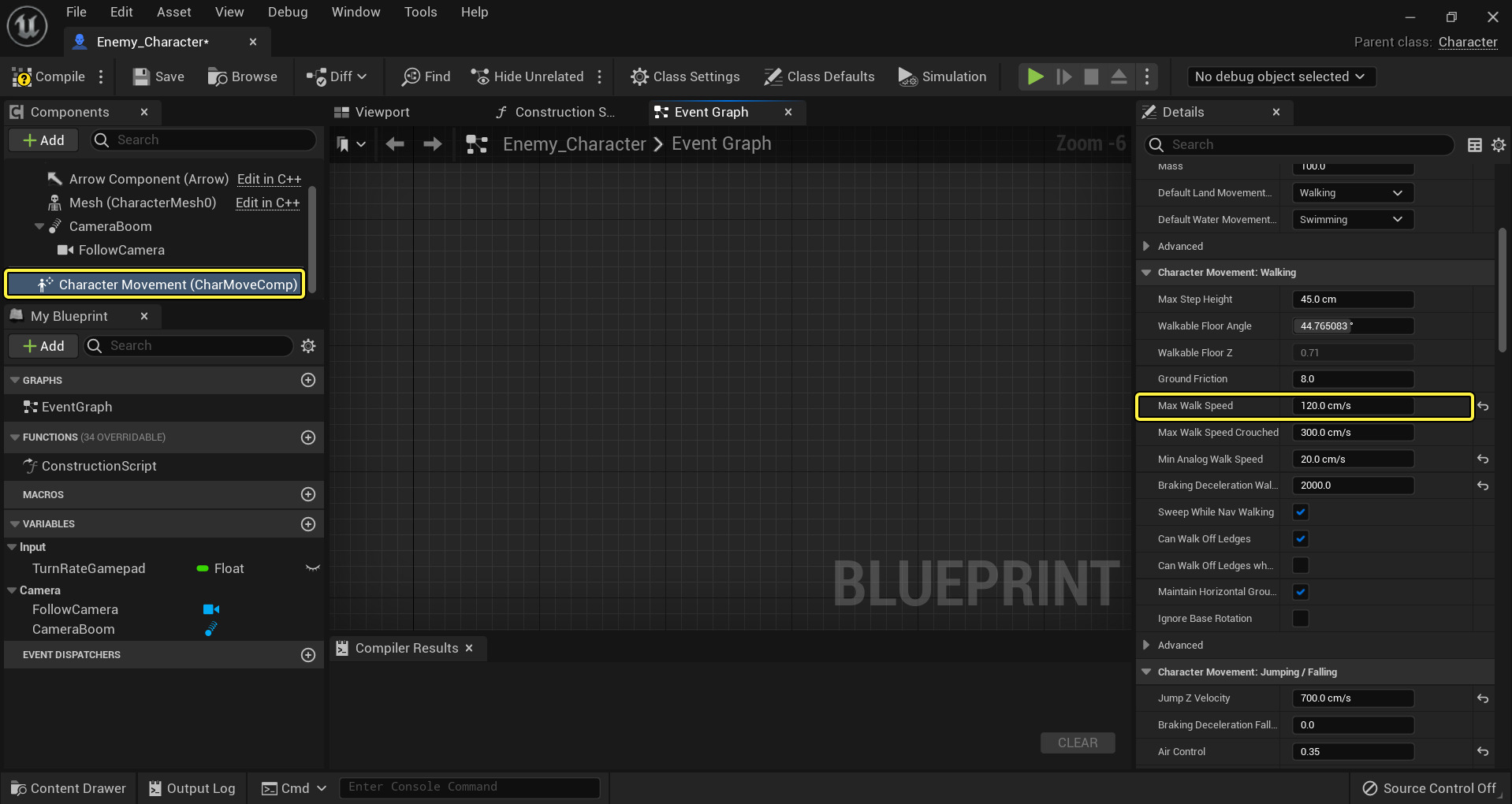 - 캐릭터 무브먼트(Character Movement) 컴포넌트를 선택하고 디테일(Details) 패널의 최대 걷기 속도(Max Walk Speed) 를 120.0 으로 설정합니다.