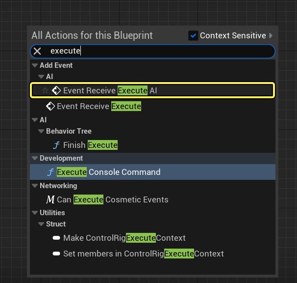 이벤트 Receive Execute AI 노드는 비헤이비어 트리 안에서 이 태스크가 활성화될 때 트리거됩니다. - 에이전트가 AI 컨트롤러인 경우 항상 AI 버전의 이벤트 Receive Execute , 이벤트 Receive Abort , 이벤트 Receive Tick 을 선택해야 합니다. 일반 이벤트 버전 및 AI 이벤트 버전이 모두 구현되어 있다면 더 적합한 버전 하나만 호출됩니다. 즉, AI의 경우에는 AI 버전이 호출되고 이외의 경우에는 일반 버전이 호출됩니다.