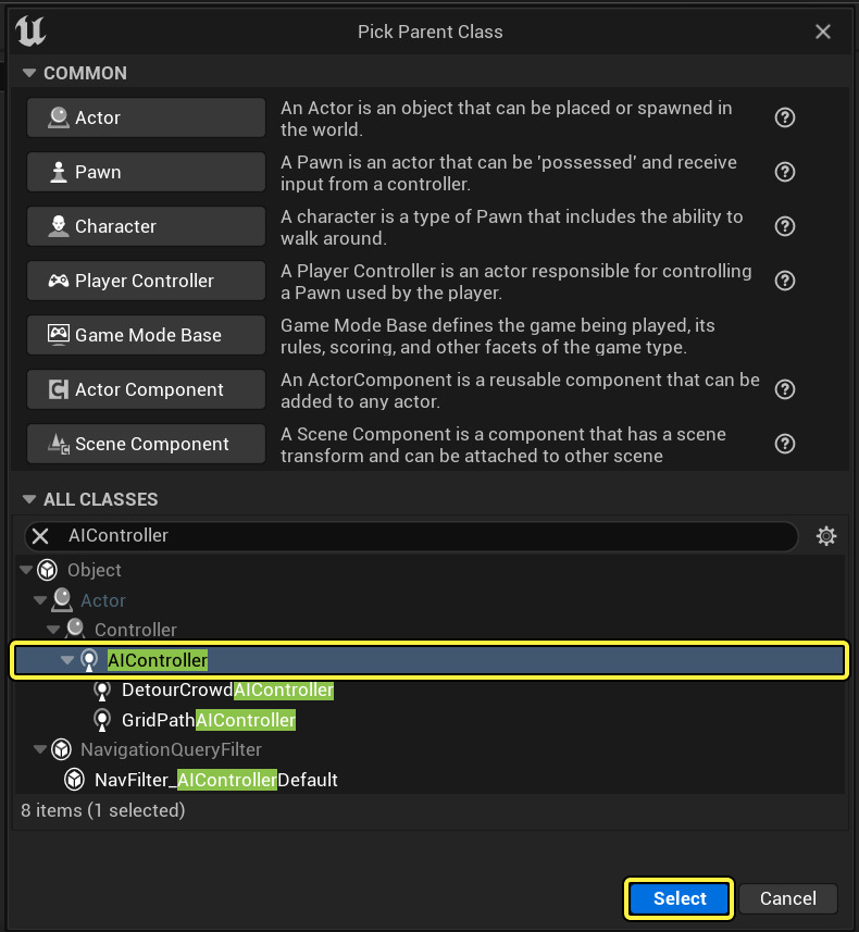 - AI 폴더에서 AI 컨트롤러(AIController) 클래스를 기반으로 새로운 블루프린트 클래스(Blueprint Class) 를 생성합니다.