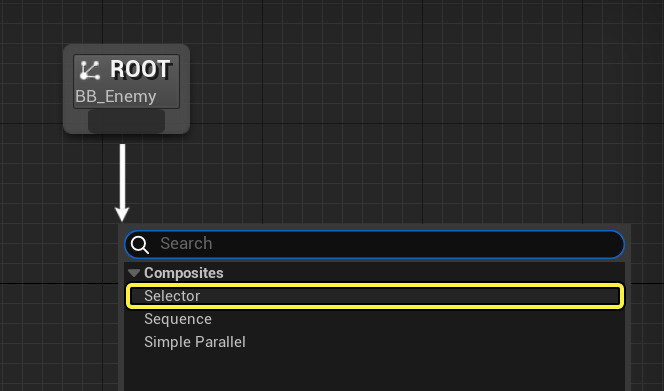 - 그래프에서 루트(Root) 를 좌클릭하고 드래그하여 Selector 노드를 추가합니다.