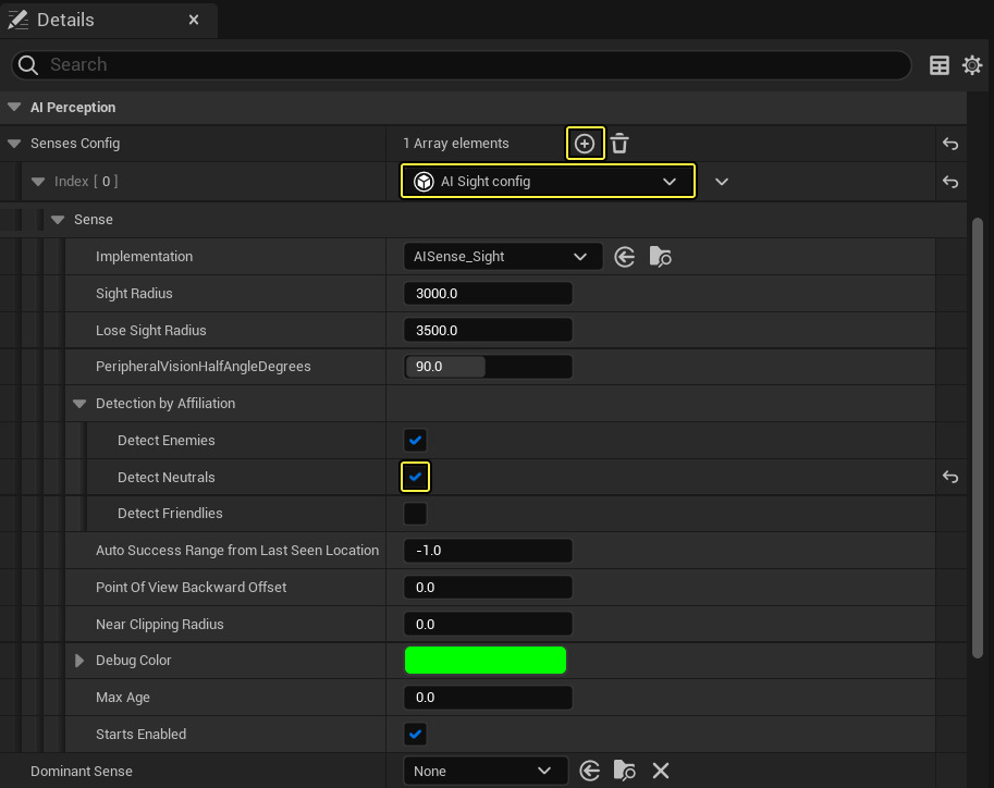 - AI 퍼셉션 컴포넌트 의 디테일(Details) 패널에서 AI 시야 구성(AI Sight Config) 을 추가하고 중립 탐지(Detect Neutrals) 를 활성화합니다.