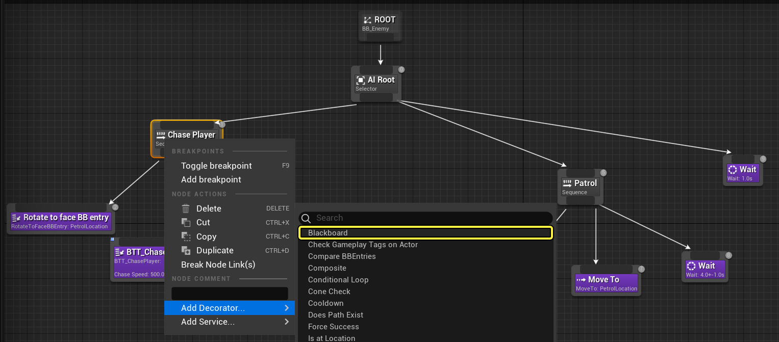 - BT_Enemy 를 실행하여 Chase Player 를 우클릭하고 데코레이터 추가...(Add Decorator...) 에서 Blackboard 를 선택합니다.