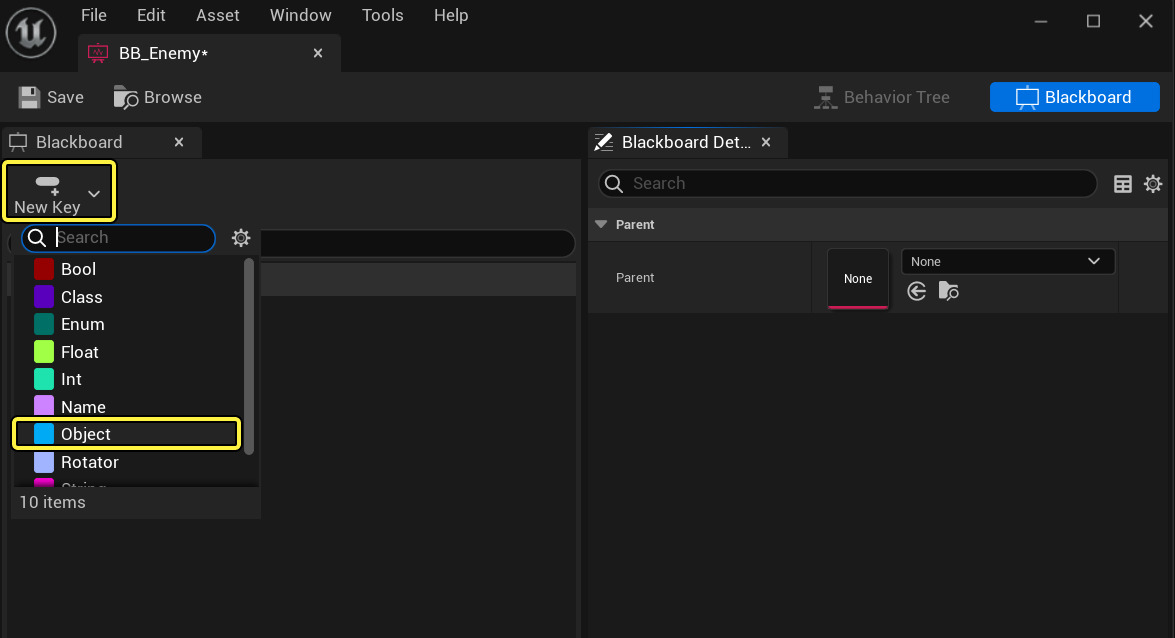 - BB_Enemy 블랙보드 안에서 새 키(New Key) 버튼을 클릭하여 오브젝트(Object) 를 선택합니다.
