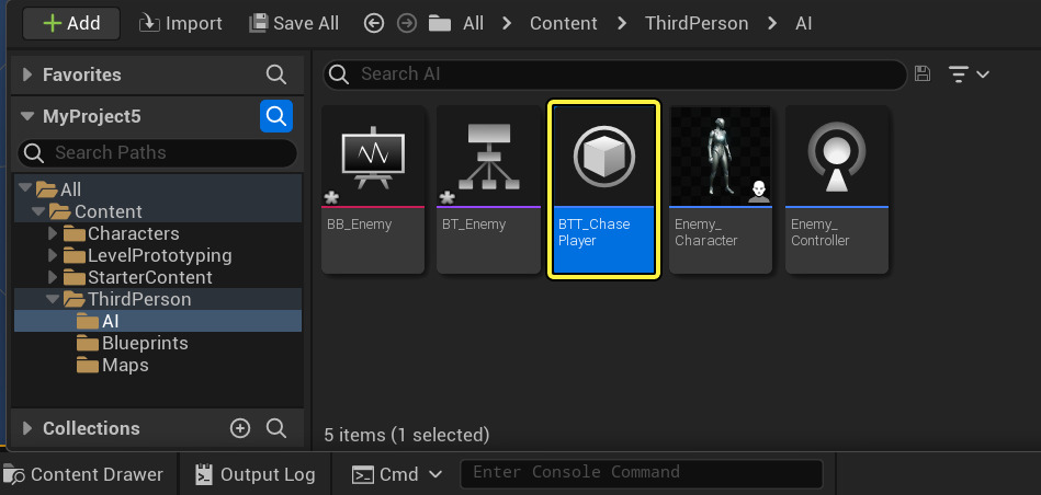 - 콘텐츠 드로어 에서 새 에셋의 이름을 BTT_ChasePlayer 로 변경합니다.