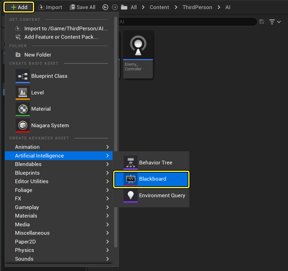 - 콘텐츠 드로어(Content Drawer) 에서 +추가(+Add) 를 클릭하고 인공 지능(Artificial Intelligence) 에서 블랙보드 를 선택한 뒤 BB_Enemy 로 이름 짓습니다.