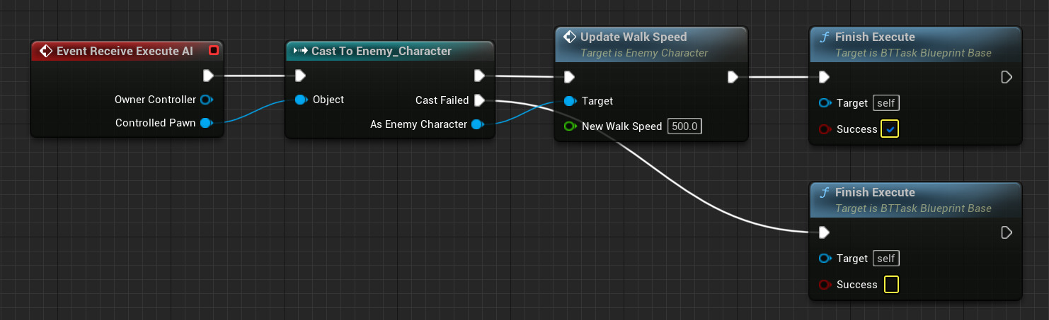 - Update Walk Speed 뒤에 Finish Execute 노드를 두 개 추가하여 아래와 같이 연결합니다.여기서는 Enemy_Character로의 형변환이 성공하면 태스크가 성공한 것으로 판정합니다. 제어되는 폰이 Enemy_Character가 아닌 경우 태스크가 성공하지 못했다고 판정하여 태스크를 중단하도록 처리해야 합니다.