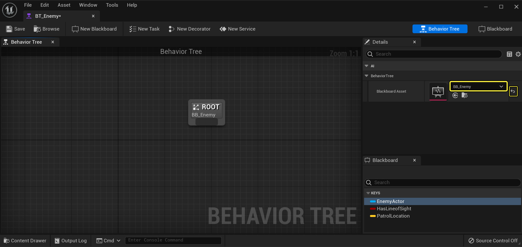 - BT_Enemy 를 열고 BB_Enemy 를 블랙보드 에셋(Blackboard Asset) 에 할당합니다.