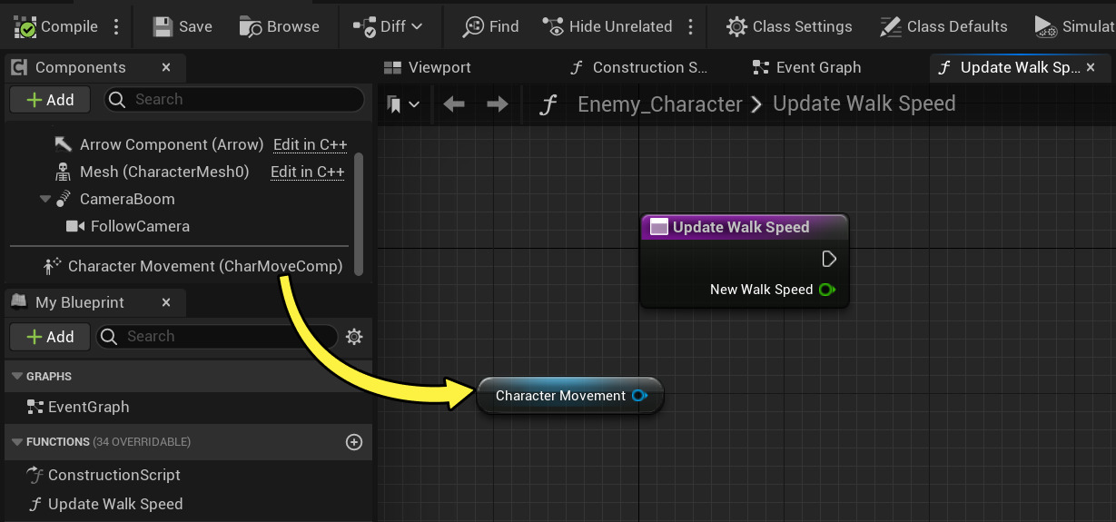 - 콘텐츠 드로어(Content Drawer) 에서 Enemy_Character 블루프린트를 실행하여 Update Walk Speed 라는 함수(Function) 를 추가합니다.