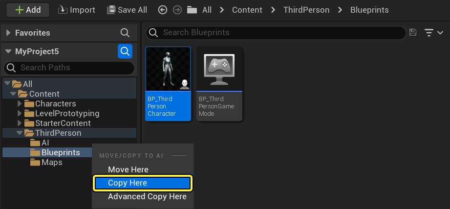 - ThirdPerson > Blueprints 폴더로 가서 BP_ThirdPersonCharacter 를 AI 폴더로 드래그하고 여기에 복사(Copy Here) 를 선택합니다.