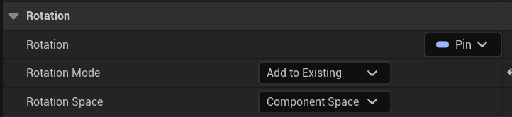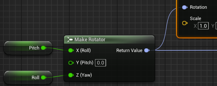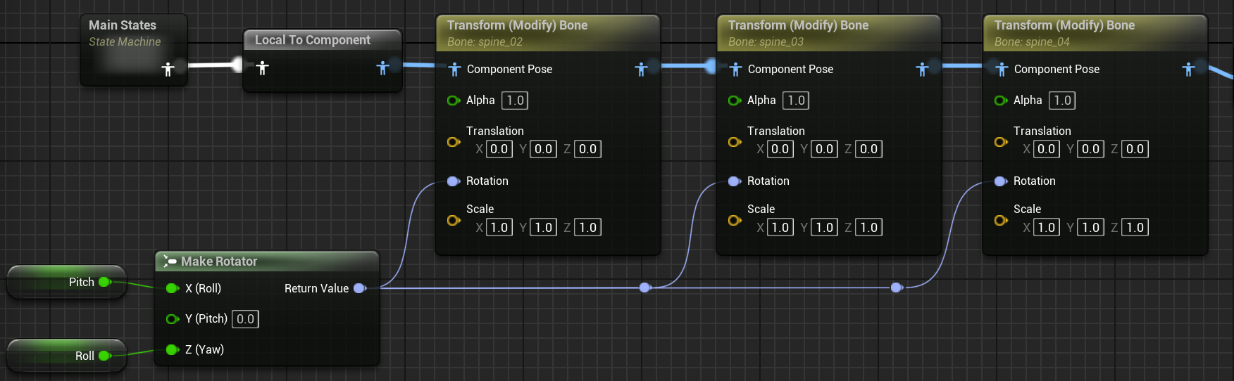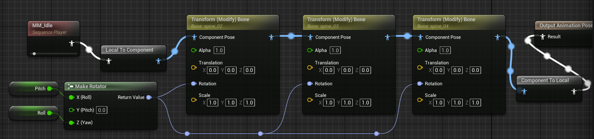 변수 Pitch와Roll을 이용해 MakeRotator노드에 연결해주고 Transform Bone의 Rotation과 연결해준다.