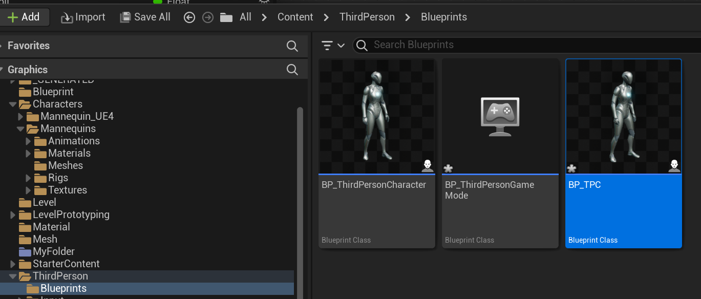 우선 BP_ThirdPersonCharacter를 BP_TPC로 카피한다.