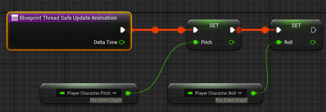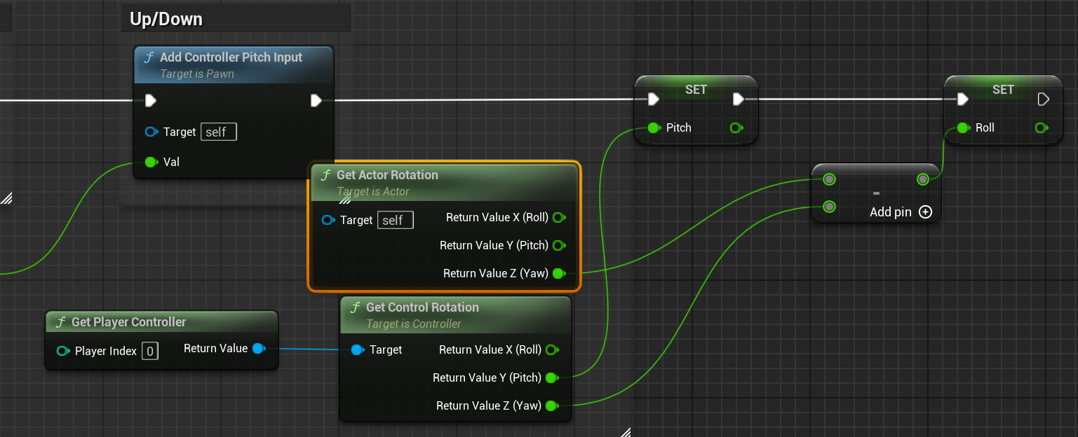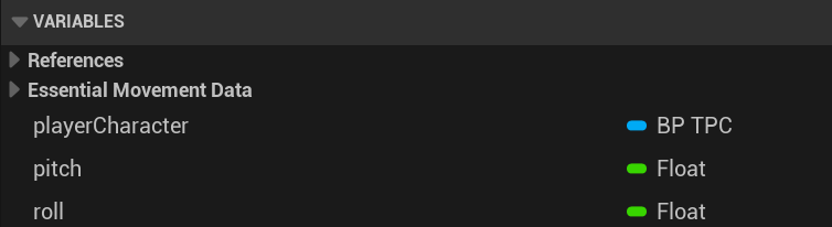 다음과 같이 Player Character의 Pitch와Roll을 지역변수 Pitch와 Roll에 저장해준다. PlayerCharacter의 Pitch와 Roll은 PropertyAccess노드를 이용했다.