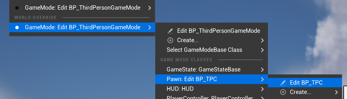 게임모드오버라이드에서 BP_TPC를 지정해준다. Play시 BP_TPC가 나타난다.