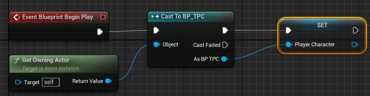 ABP_MannySkeletonRotate에 BeginPlay Event를 오버라이드하고 CastToBP_TPC Out을 변수로 승격해서 PlayerCharacter변수를 만들어주고