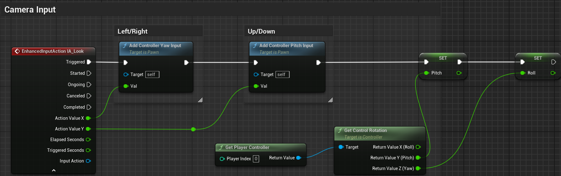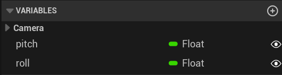 EventGraph의 Camera Input Block뒤에 Control Rotation의 Pitch와 Yaw를 저장할 Set Pitch Set Roll을 추가해준다.