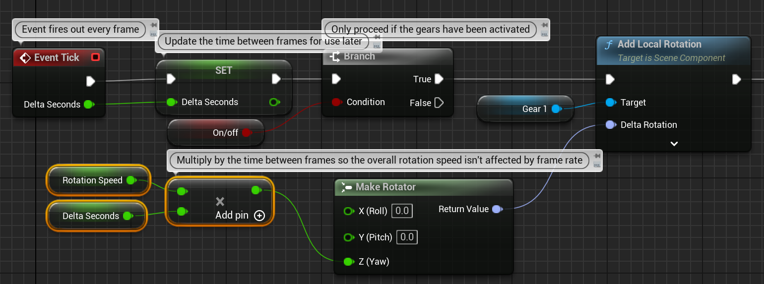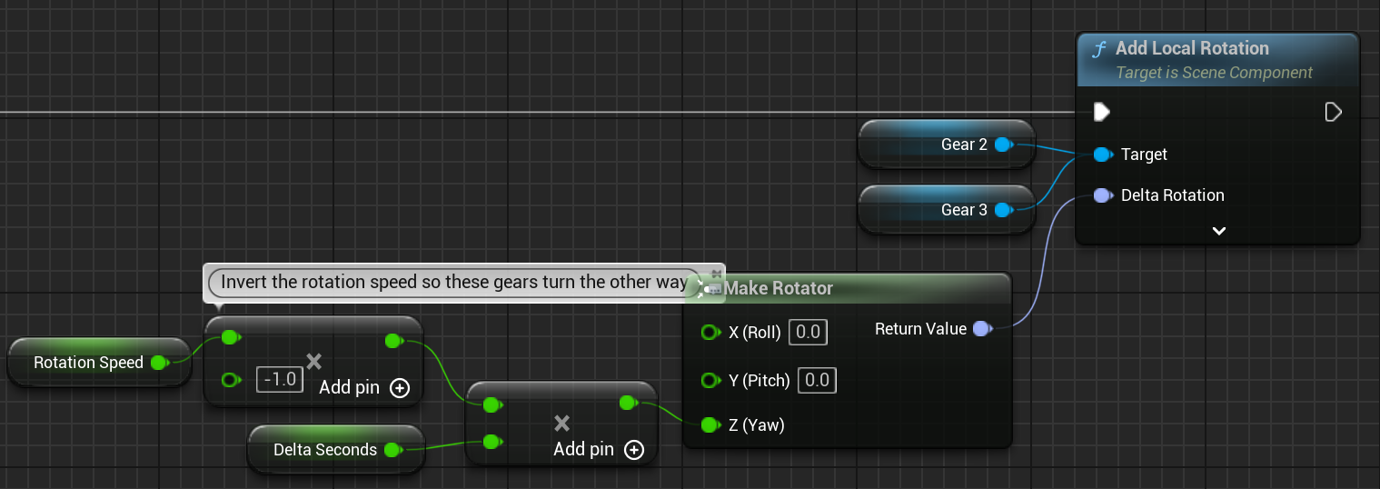이벤트그래프에서 EventTick에 AddLocalRotation함수를 이용해 가운데 기어1를 회전시켜준다.