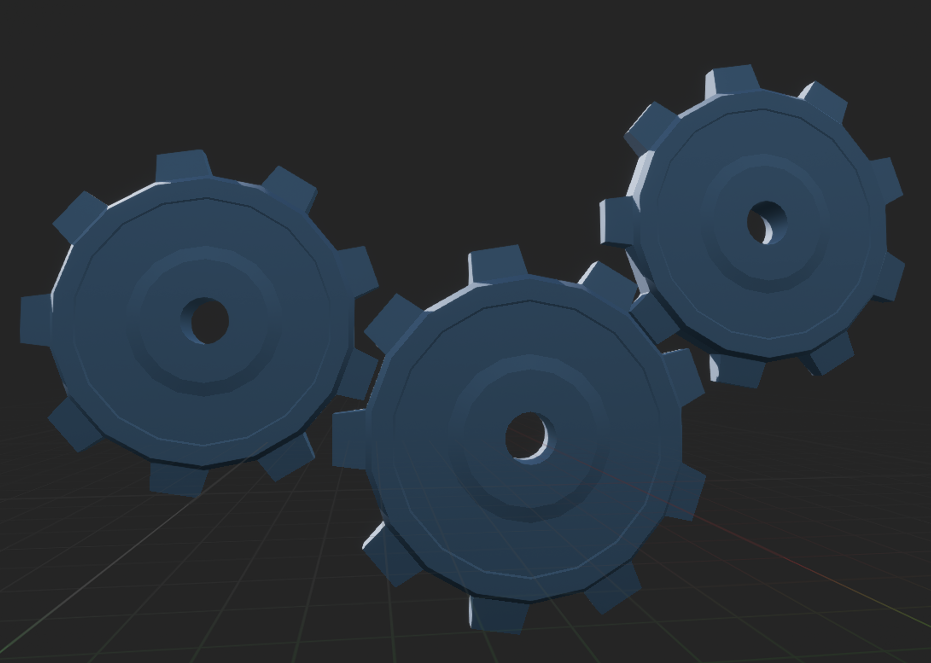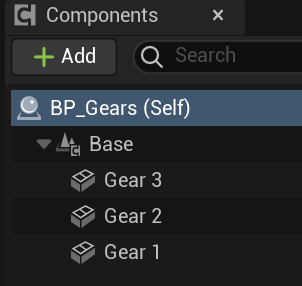 BP_Gears 블루프린트를 만들고 Static_Mesh3개를 컴포넌트로 추가해주고 Mesh는 SM_Gear를 지정한다. 가운데 기어가 1 양쪽이 2,3번이다. 모든기어는 기어수가 9개 이다. 3개의 기어는 같은 SM_Gear를 사용하지만 스케일이 0.85, 1, 0.9로 약간씩 다르나 기어수가 모두 9개로 똑같아 RPM은 동일하다.