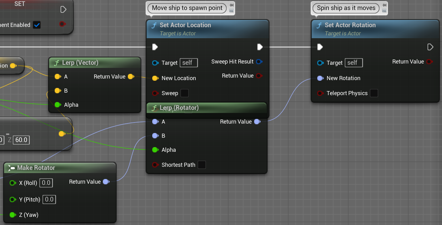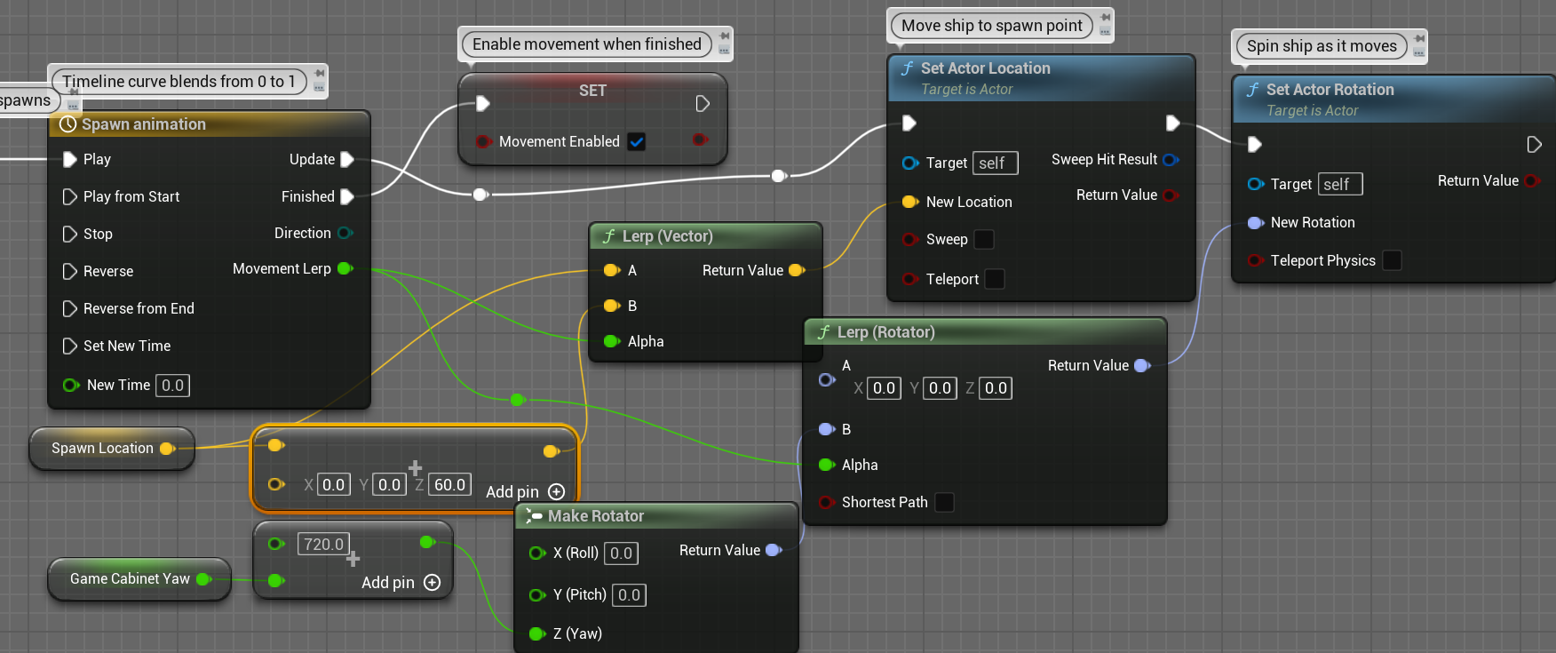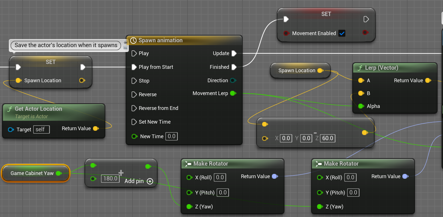 저장된 Yaw와 SpawnLocation을 이용 약간 위로 뜨면서 2바퀴도는 애니메이션을 Timeline노드와 Lerp를 이용해 만든다.