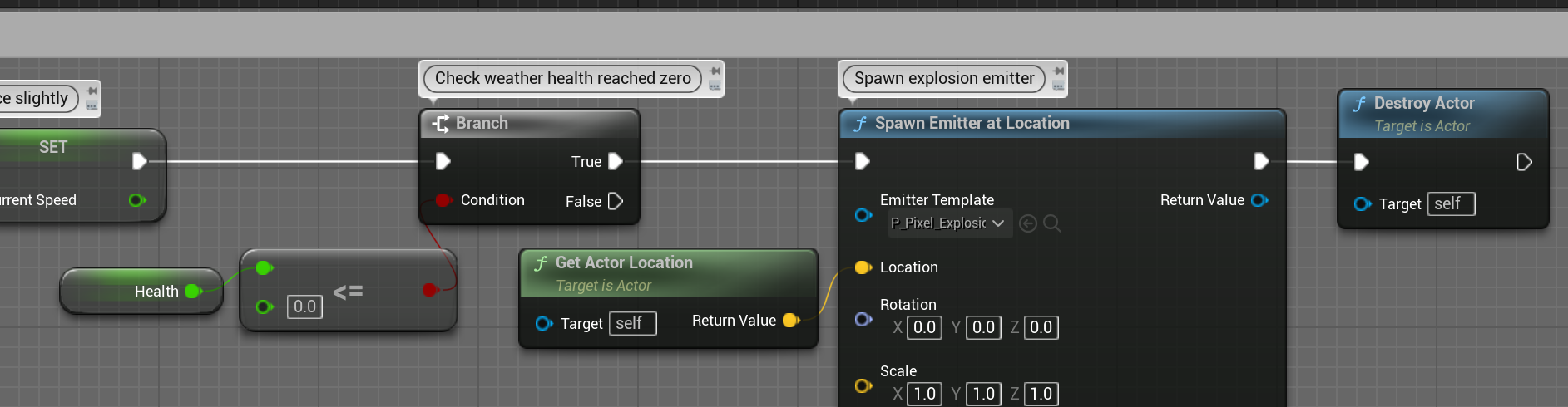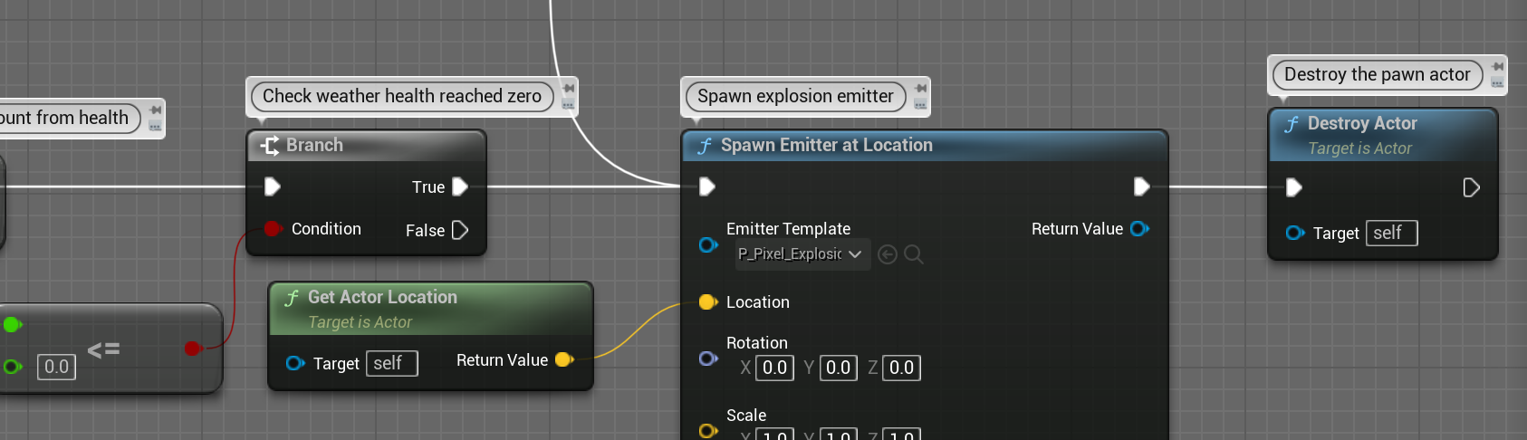 0보다 작아지면 폭파 파티클을 스폰해주고 자신을 파괴합니다.