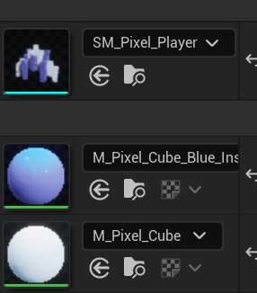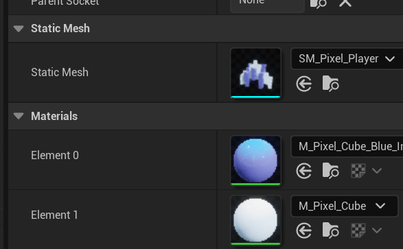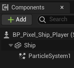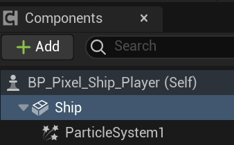 Player는 BP_Pixel_Ship_Player이고 부모는 Pawn이고 컴포넌트는 메시와 파티클시스템이다.