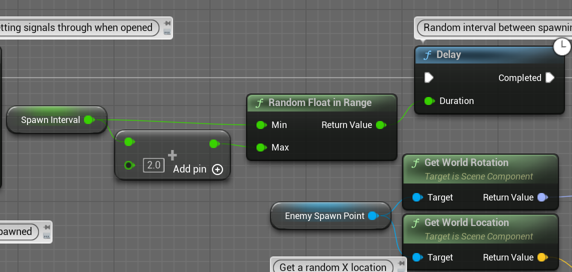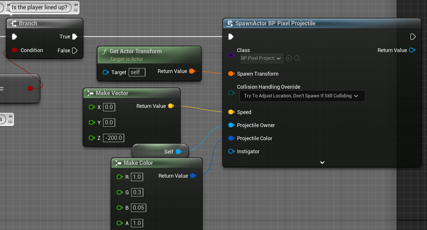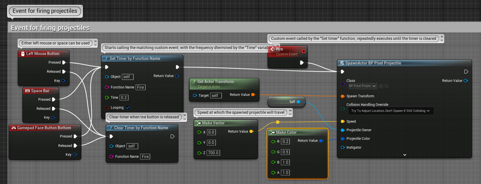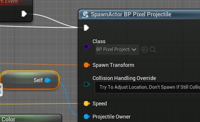총알 발사 로직이다. 입력이 들어오면 TimerEvent를 이용해 쿨타임을 만들고, 입력이 떨어지면 지운다. BP_Pixel_Property라는 총알을 스폰해준다.