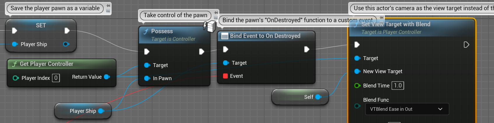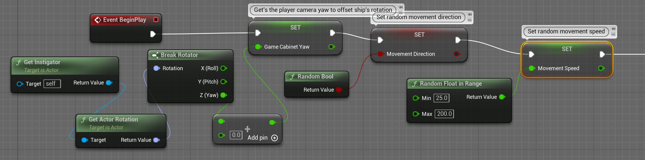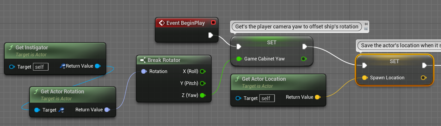 Player는 BP_Pixel_Ship_Player spawn되면 Event beginPlay를 실행할꺼고 Cabinet Yaw와 Spawn Location을 저장한다