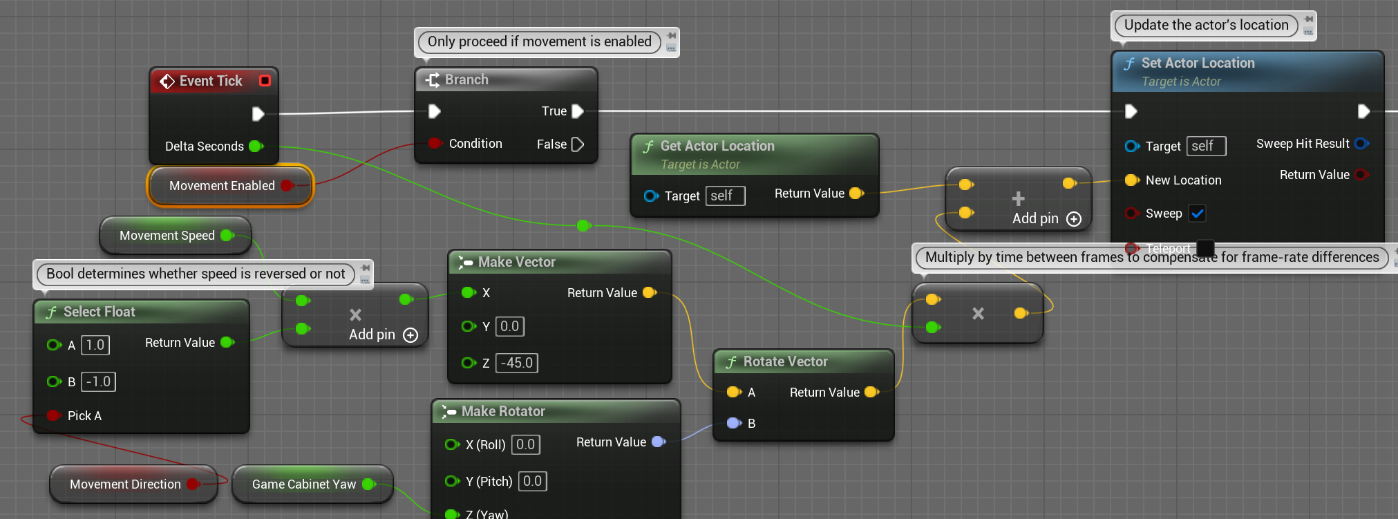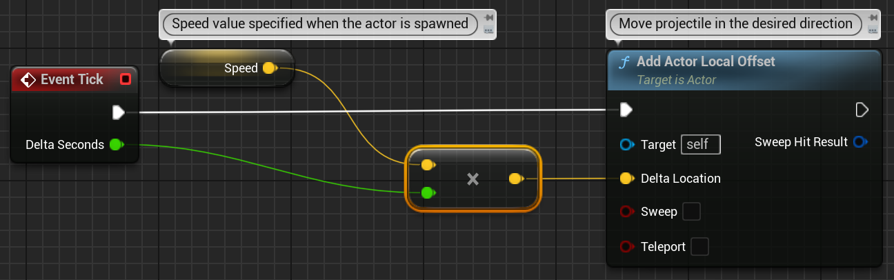 Location이 아닌 AddActorLocalOffset를 사용하여 이동시키는것 같습니다. 스피드변수는 디폴트가 (0,0,250)이므로 위로 날라가네요