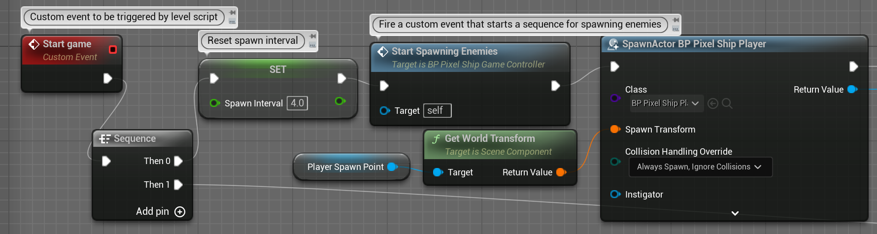 BP_Pixel_sSHipGameController의 StartGame Event는 적을 만드는 이벤트를 부르고 플레이어를 만들어준다.