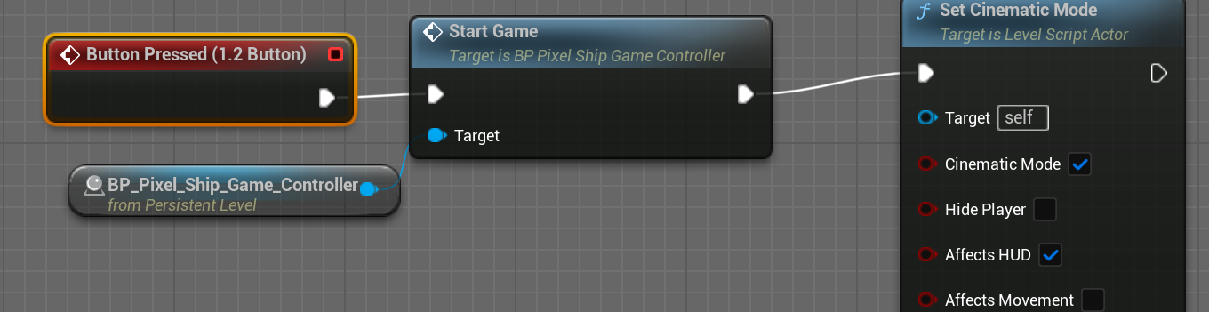 레벨블루프린트에서 buttonPressed(1.2)이후의 노드에서 BP_Pixel_sSHipGameController의 StartGame Event가 Call