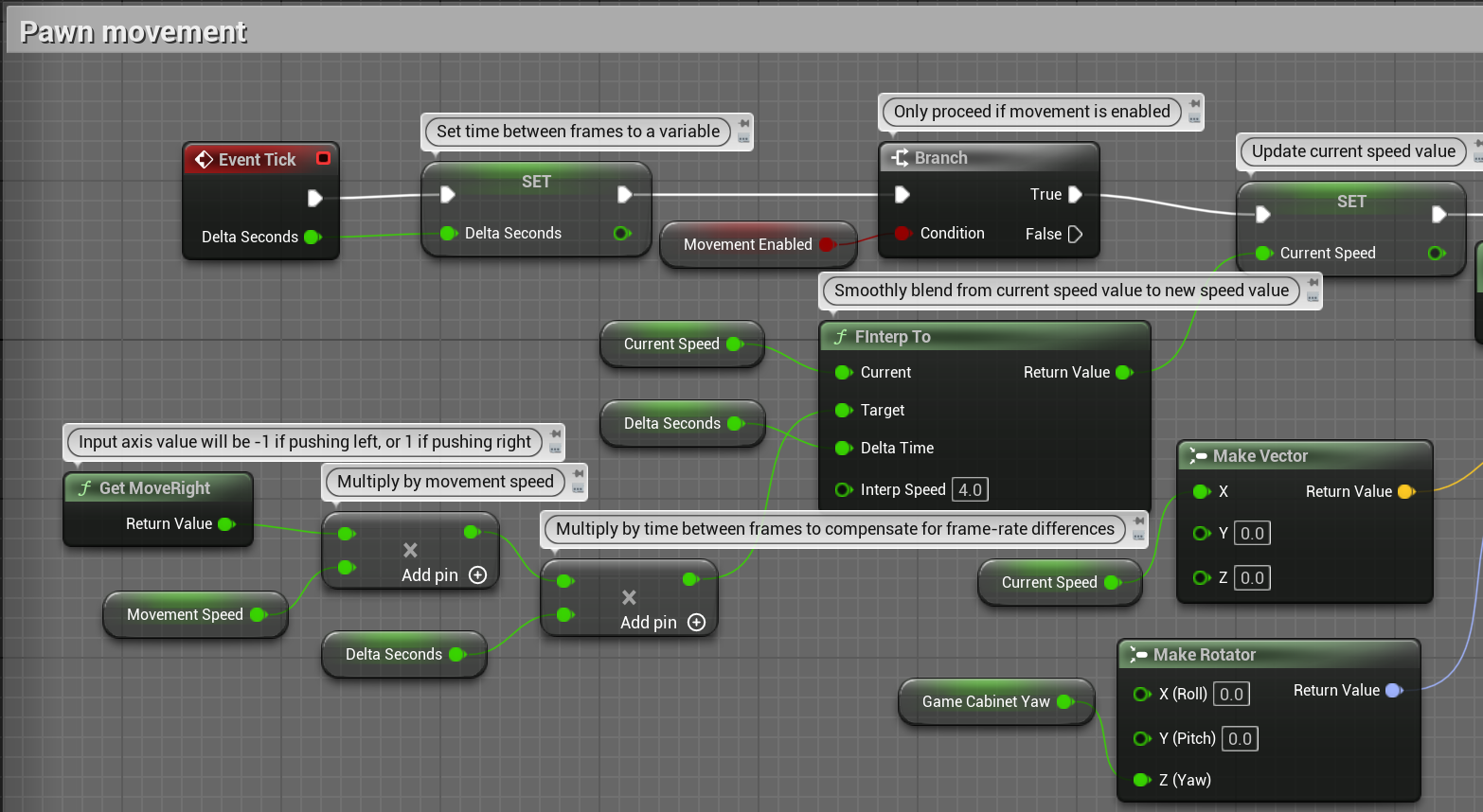 보통 이동은 InputEvent를 사용하는데 Tick에서 구현한 이유가 애니메이션을 위해 FInterpTo, RInterpTo를 사용하기 위해서인것 같다.