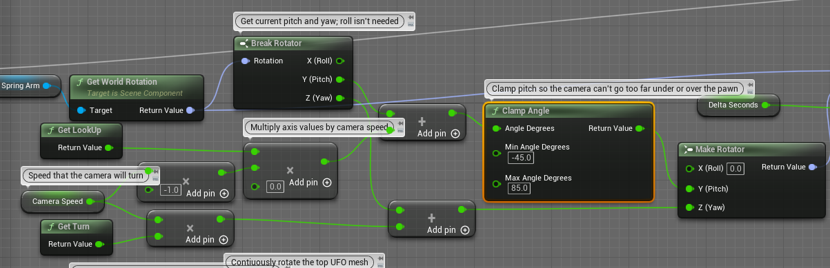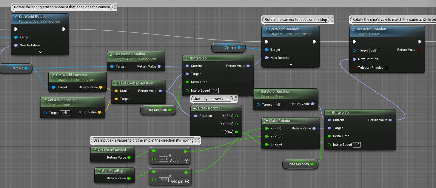 이후 부드러운 카메라워크를 위해 SprintArm, Camera등이 RinterpTo를 이용해 부드럽게 움직이게 해주고 우주선도 카메라축에 맞춰 회전시켜준다.
