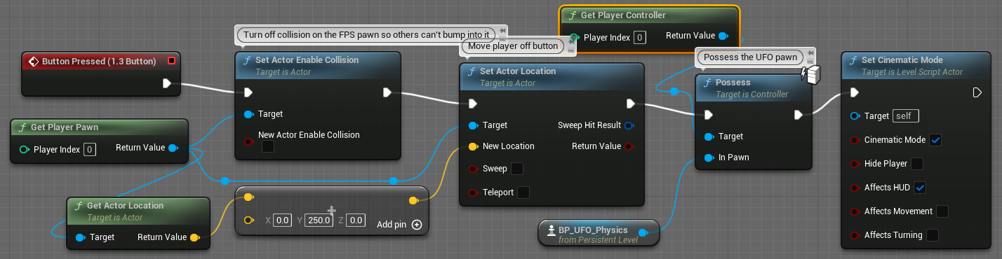 원형 발판은 BP_Button_Dispatch이고 이전 예제와 동일하게 Call Button Pressed함수를 호출한다. 이건 레벨블루프린트에 있다. DefaultPawn을 특정위치로 옮겨주고 BP_UFO_Physics를 포제스해준다. 이후 시네마틱모드로 변경해준다.