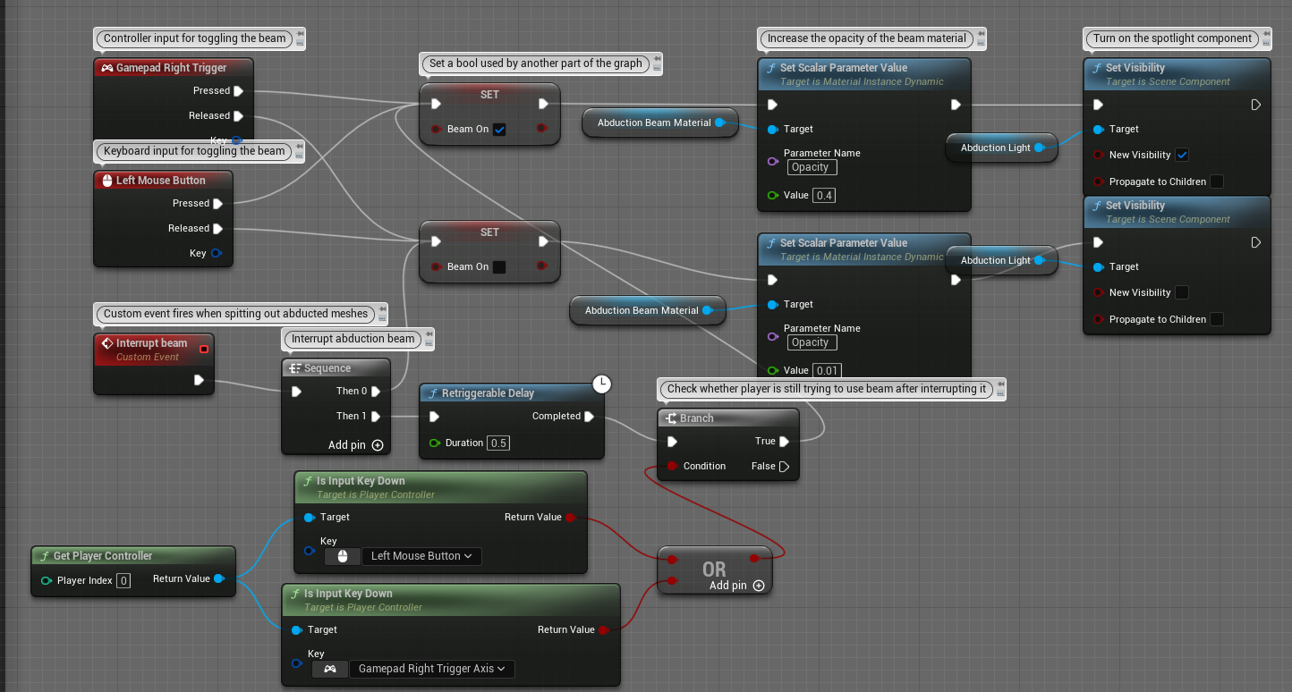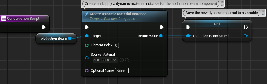 dynamic Material Instance를 만들어 Abduction Beam Material에 저장해주고 있다.