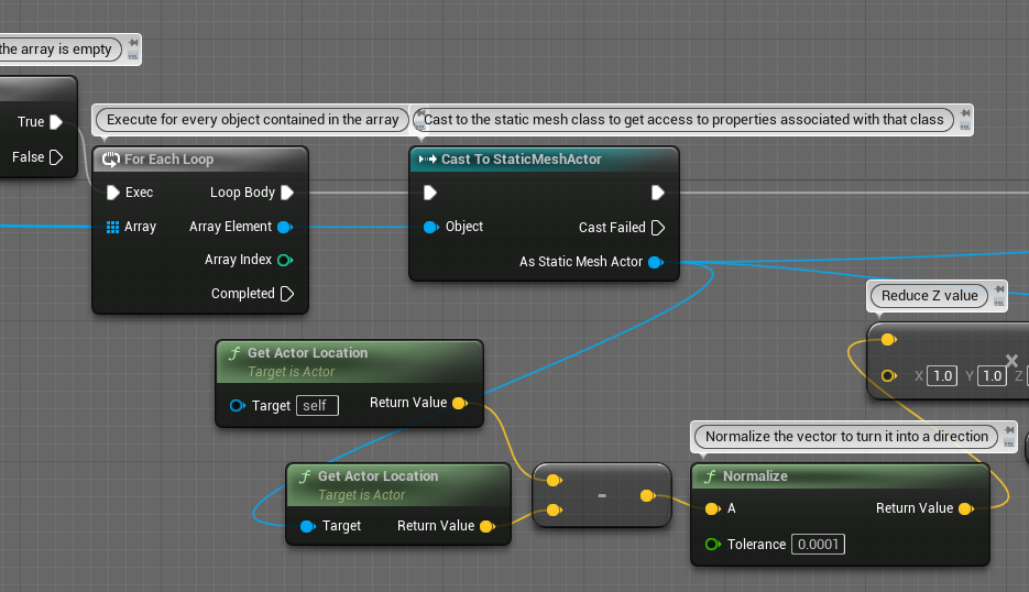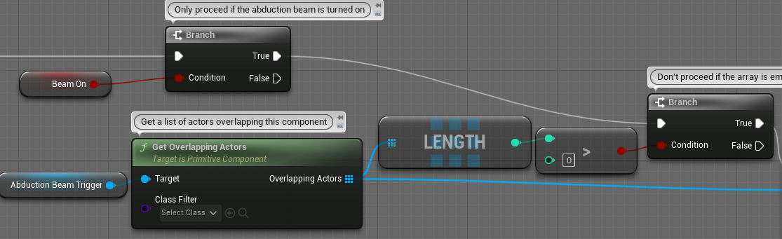 변수가 켜지면 루프의 마지막에 변수를 체크하는 Branch가 있는데 AbductionBeamTrigger와 오버랩핑된 액터배열을 리턴한다. 감지하고 싶은 액터에 콜리전 프리셋을 잘선택해야한다.