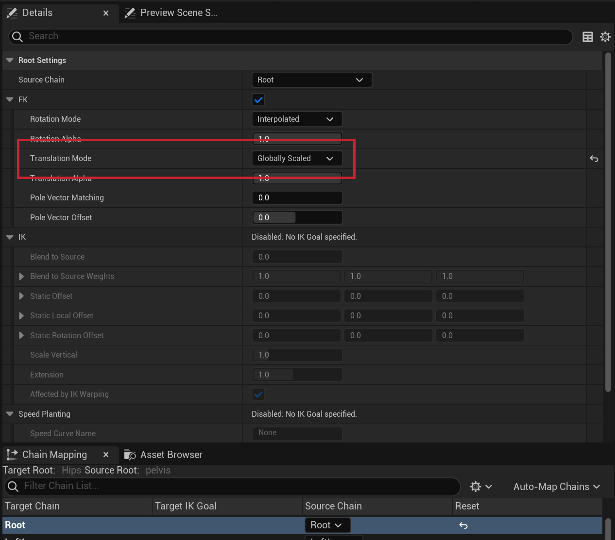 리타게터에서 소스체인 설정 후, 해당 타겟 체인을 클릭해서 디테일 창을 확인해보면 Translation Mode라는 항목이 존재하는데 해당 항목으로 Absolute로 설정해 준다.