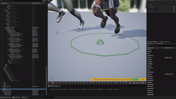이 문제는 리타게터에 IK 관련 체인이 설정되어 있지 않기 때문이다. Mannequin 기준으로 IK 본을 가져와 Control Rig에서 IK 조절을 하는데, 해당 본이 정상적으로 리타게팅이 되지 않았으니 바닥에 다리가 붙어버리게 된다.