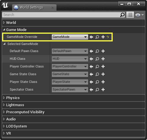 개별 맵에 대해 프로젝트 세팅을 덮어쓰려면, 에디터에서 World Settings 의 Default Game Mode 를 설정합니다.