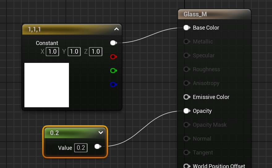 머터리얼을 만들고 노드 선택후 BlendMode를 Translucent로 선택후 Basecolor와 Opacity를 설정해 유리 머터리얼을 만들고