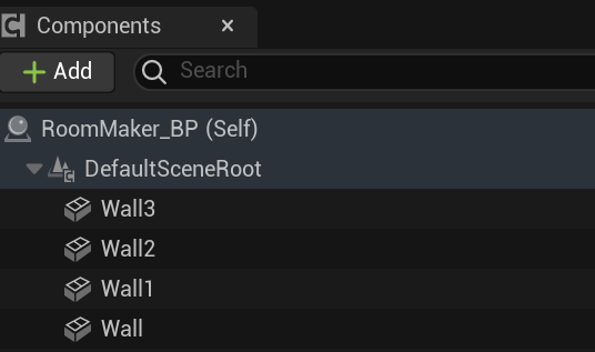 StaticMesh를 컴포넌트로 추가하고 이름을 Wall 메시는 다음과 같이 설정하고 Wall을 3번더 복사해서 방을 만들어준다.