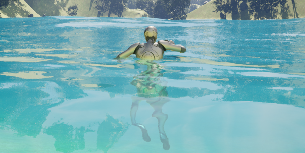 실행해보면 캐릭터가 물위에 있고 중력을 -로 하면 가라 앉는데 중력을 0으로 하고 레벨의 워터에셋에서 옵셋을 -150으로 해서 강제로 가라앉혔다. 이건 서있는 자세라서 그렇고 만일 수영하는 애니메이션이라면 -50정도면 될것 같다.