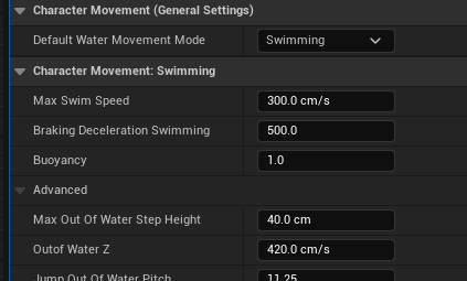 기타 Character Movement Swimming설정을 다음과 같이 해봤는데 재미는 못봤다.