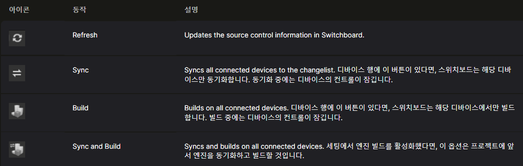 소스 컨트롤을 스위치보드(Switchboard)에 연결한 다음 프로젝트와 엔진을 특정 체인지리스트에 따라 연결된 모든 디바이스에서 동기화 및 빌드할 수 있습니다. 각 연결된 디바이스에 어떤 체인지리스트가 있는지 보고 어떤 것을 업데이트할지 파악할 수 있습니다.