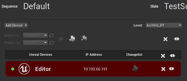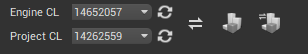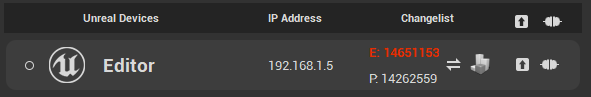 소스 컨트롤 정보가 추가되면 스위치보드(Switchboard)의 디바이스 목록 위에 엔진 및 프로젝트 체인지리스트가 표시될 것입니다. 이는 모든 디바이스에 대해 현재의 체인지리스트가 지정되는 위치가 단 한 곳이란 의미입니다.이 스크린샷에는 프로젝트 체인지리스트와 엔진 체인지리스트가 나와 있습니다.소스 컨트롤 버튼