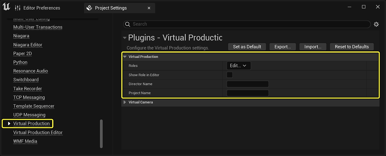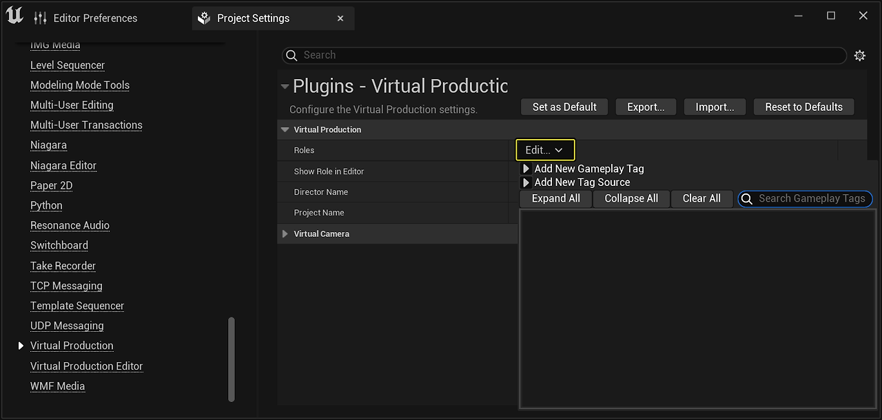 프로젝트 세팅의플러그인(Plugins)섹션에서버추얼 프로덕션(Virtual Production)플러그인 세팅을 엽니다.