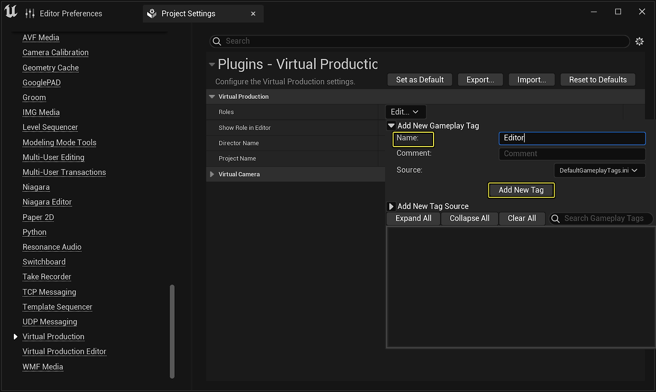 새 게임플레이 태그 추가(Add New Gameplay Tag)를 펼치고 역할의 이름(Name)을 입력합니다.새 태그 추가(Add New Tag)를 선택하여 역할을.ini파일에 추가합니다.