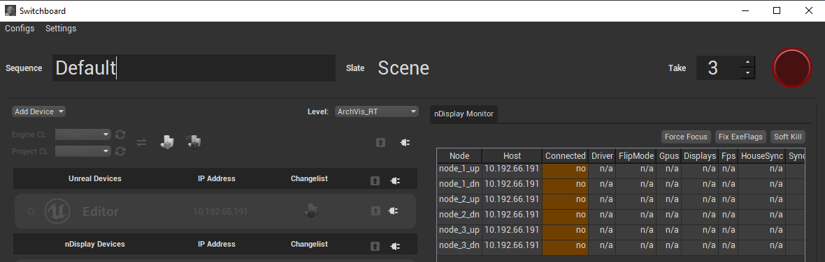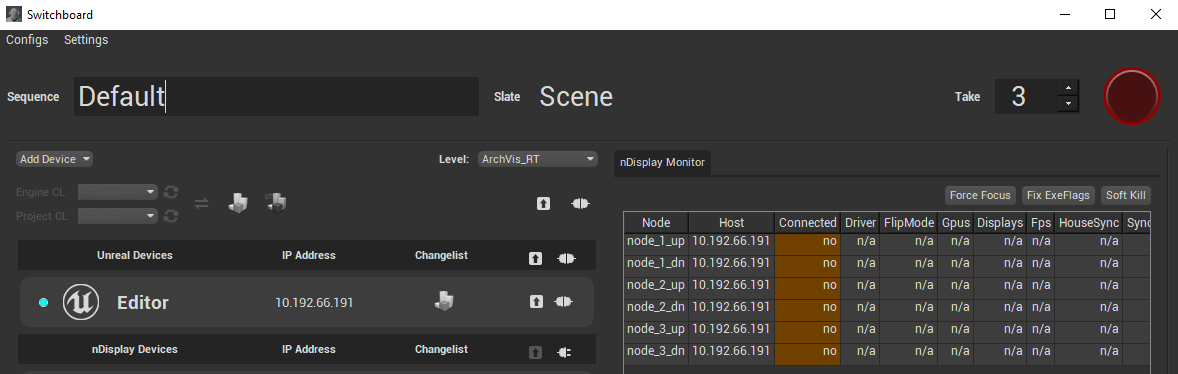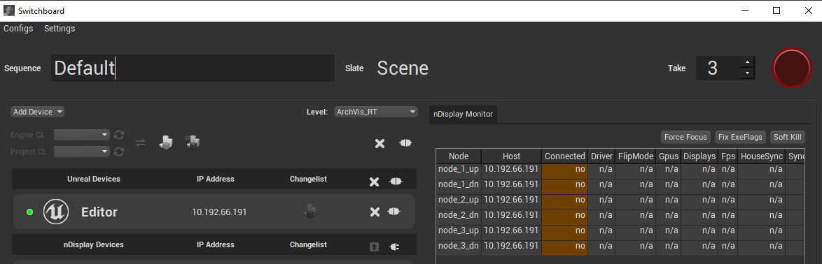 스위치보드(Switchboard)가 모든 nDisplay 디바이스와 커뮤니케이션하도록 설정할 수 있습니다. 스위치보드에 nDisplay 디바이스를 추가하려면nDisplay 환경설정 파일의 위치를 추가합니다. 스위치보드는 환경설정 파일을 파싱하여 파일에 지정된 클러스터 노드를 스위치보드 디바이스로 변환합니다. 스위치보드에서 nDisplay 디바이스를 구성하는 방법에 대한 자세한 정보는스위치보드 세팅을 참고하세요.