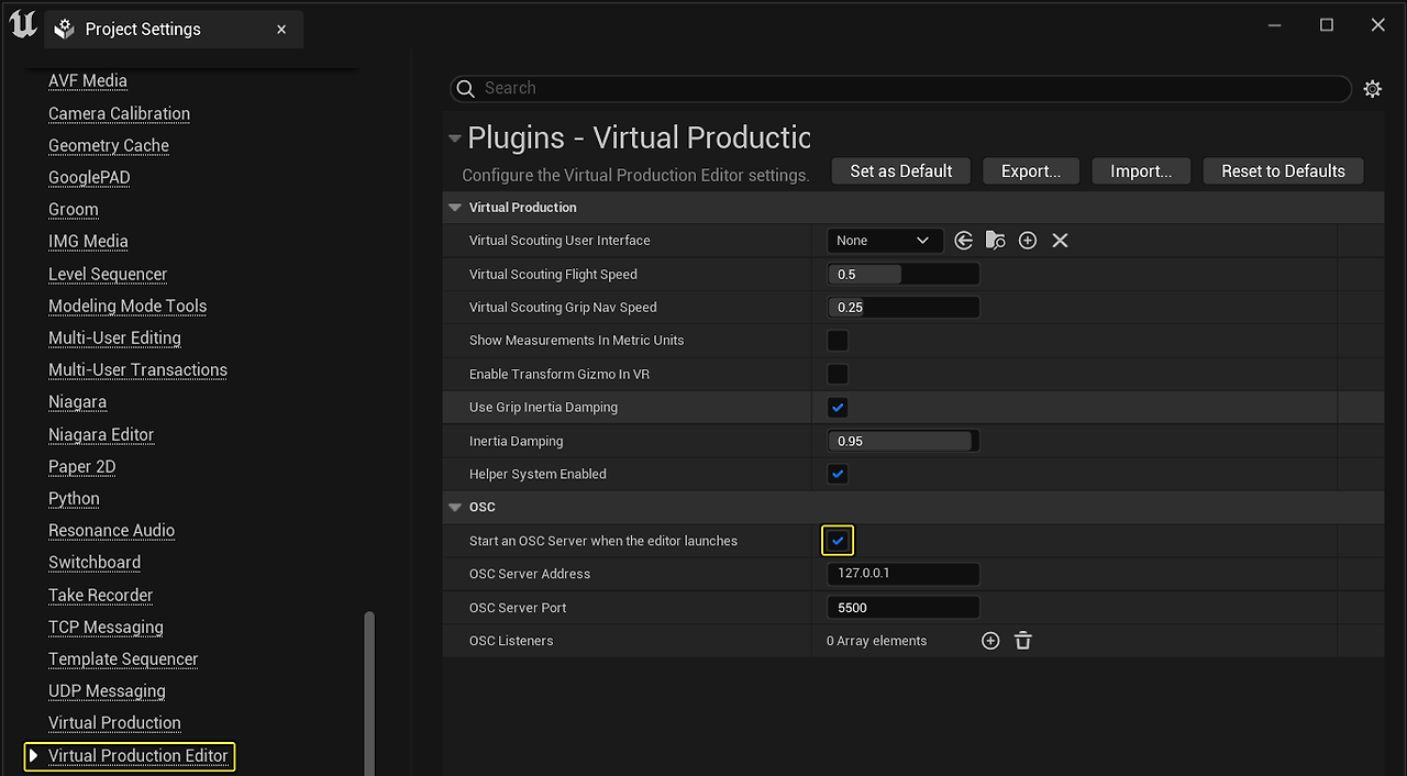 버추얼 프로덕션 에디터(Virtual Production Editor)플러그인에서에디터 실행 시 OSC 서버 시작(Start an OSC Server when the editor launches)을 활성화합니다.