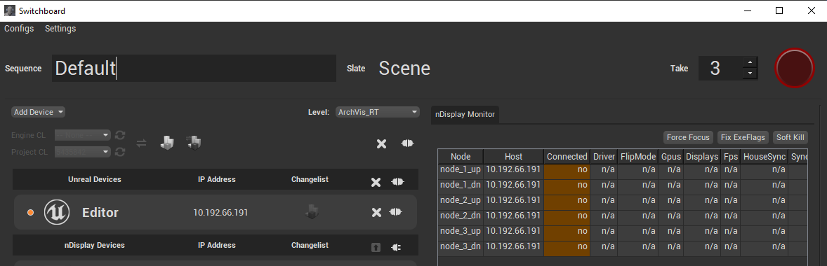 연결된 언리얼 디바이스에서 스위치보드(Switchboard)에 임베드된 테이크 레코더(Take Recorder) 기능을 사용하여 테이크를 녹화할 수 있습니다. 스위치보드는 녹화를 위해OSC를 사용하여 언리얼 인스턴스(Unreal Instance)와 커뮤니케이션합니다. 스위치보드 플러그인은 이 연결을 생성하기 위한 디폴트OSC 리스너(OSC Listener)를 포함합니다.