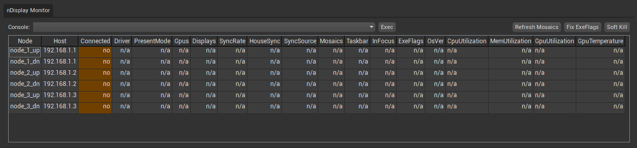 콘솔(Console)텍스트 박스에 명령("stat fps" 또는 "r.RayTracing.SceneCaptures 0" 등)을 입력하고실행(Exec)을 클릭하여 nDisplay 클러스터에 원격으로 명령을 실행할 수 있습니다.